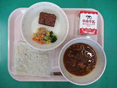 本日の献立:肉みそきしめん・牛乳・ブロッコリーサラダ・手作りチョコケーキ