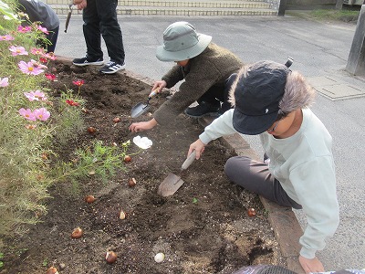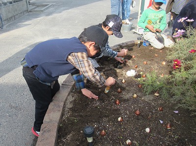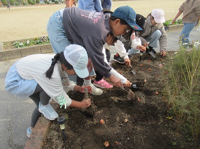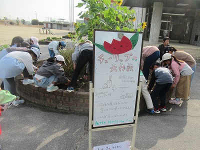 玄関前の丸花壇に、チューリップの球根をうえて、春には赤・白・黄色・ピンク・紫のチューリップが咲いてくれます。200球以上を、有志の児童でうえました。