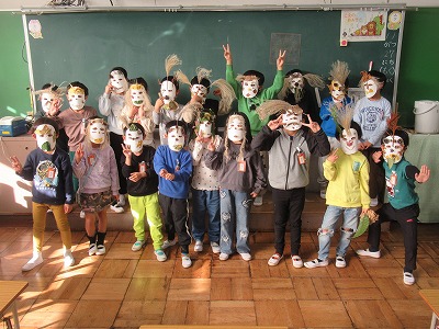 また、生活科で取り組んだ『お面』が完成したので、みんなで記念写真を撮りました♪