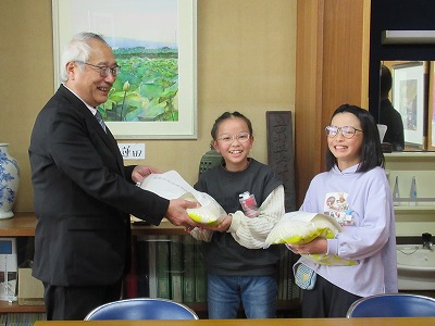 5年生が田植え、稲刈りをしたお米です。代表児童が、担当者に渡す式を校長室にて行いました。