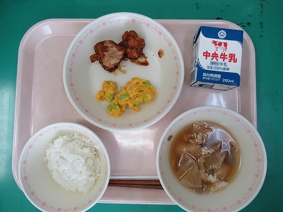本日の献立:ごはん・牛乳・揚げ鳥の味噌がらめ・かぼちゃサラダ・きつね汁