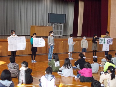 全校の子どもたちが本に親しむように、図書委員会の子どもたちが1~3年生に読み聞かせを行ってくれます。また読書郵便(お気に入りの本の紹介をカードにまとめ、友達やなかよし班のメンバーに出す)についても図書委員会の子どもたちが取り組んでくれます。