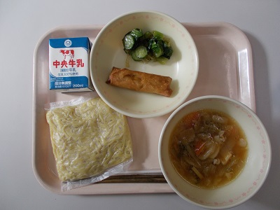 ちゃんぽん麺、春巻き、糸寒天の中華サラダ、牛乳