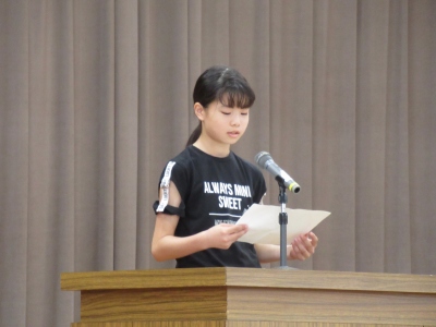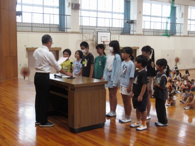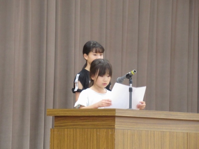 その後、代表児童2名が『誓いの言葉』を、これからに向けた誓いを堂々と発表しました。また、後期の学級委員の認証が行われ、学級では係活動などが話し合われ、着々と学級生活が再スタートです。目前にせまった運動会という大きな行事もありますが、そのほかにも、多くの行事や学習・生活で、大きく成長していきましょう。