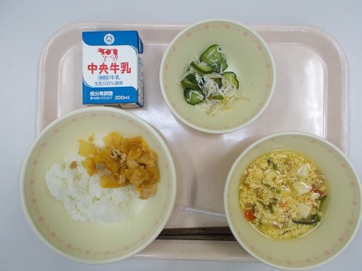 キムタクどん(ごはん)、しらす和え、トマトと卵のふんわり汁、牛乳