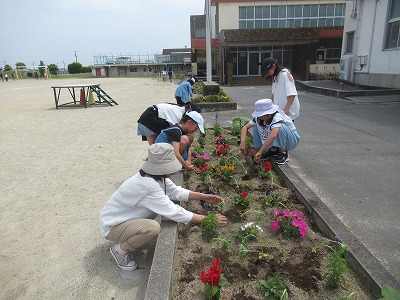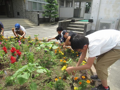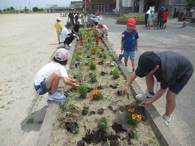 夏の花といったら、ひまわりです!大輪のひまわりをいっぱいにしてみましょう!ということで、児童の有志で、休み時間に花壇いっぱいにひまわりの苗を植えました。