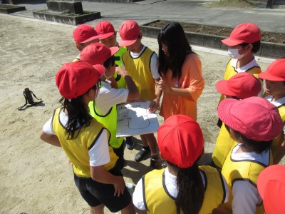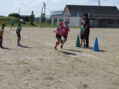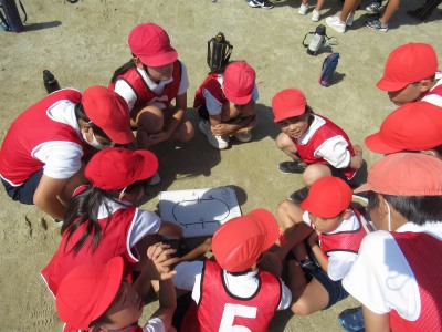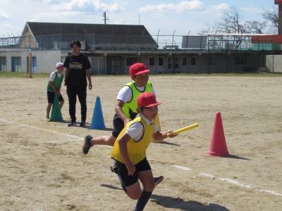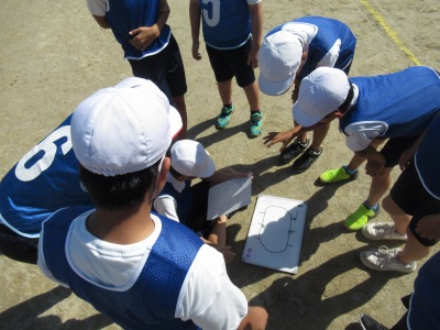 チームごとに、バトンゾーンをどう活用するか、どの場所で受け渡すのか作戦を話し合いました。バトンパスは、うまくいったことも、いかなかったこともありました。つい、力がはいって熱くなっていた人もいました。みんなで一つになれる種目です。さすが高学年、時間を上手に使って、いかにバトンパスでつなげられるか!!チームで熱心に練習に取り組んでいました。