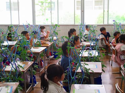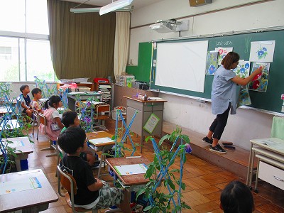 1年生が育てているあさがおが、大きくなりました。鉢ごと教室に持ち込んで、観察しあさがおの絵を描きました。
