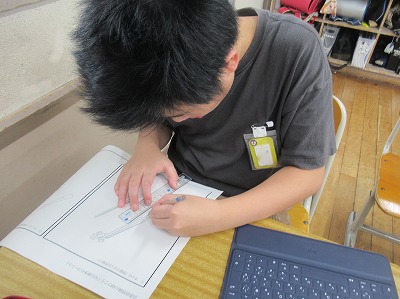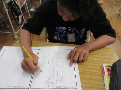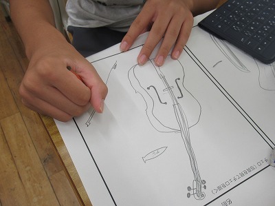 セロとは、チェロという楽器です。まずは、チェロの演奏を聴いたのち、バイオリンと同じ弦楽器で、大きいんだよというヒントだけで、想像で描いてもらいました。ギターや琵琶に似ている部分もありますが違います。次に調べて描きました。みんな写真をみて精密に描いてくれました。その後、弾いている人も入れると、大きさが伝わる楽器がしっかりと描かれていました。とてもステキです!