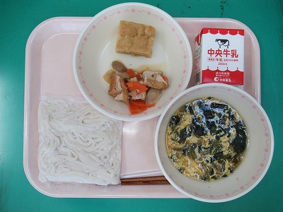 本日の献立:卵とじうどん・牛乳・里芋と生揚げの煮物・栗入りはちみつきな粉蒸しパン
