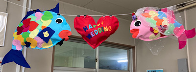鯛飾りは結婚される先生のこれからの幸せを祈り、教職員の皆さんがお休みの日に作成してくれたものです。あたたかな教職員の雰囲気が伝えわる鯛飾りでした。