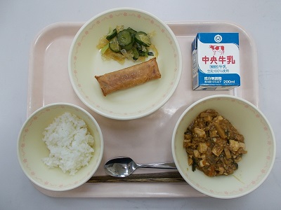 ごはん、マーボー豆腐、春巻き、糸寒天の黒酢づけ、牛乳