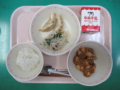 本日の献立:ごはん・牛乳・焼きぎょうざ・マーボー豆腐・バンサンスー