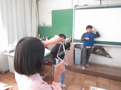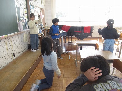 糸電話の先にあるトライアングル。糸をピンと張る時と、糸をたるませる時ではどうちがうかな?グループで役割を交代しながら、条件を変えて繰り返し試して、考えることができました。