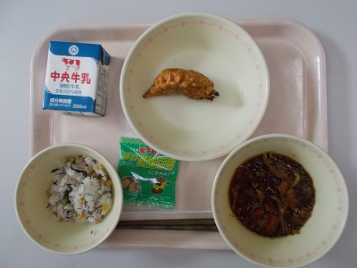 ひじきごはん、津餃子、あおさ汁、乾燥豆腐、牛乳