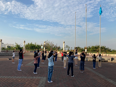 晴天のもと野外活動の2日目が始まりました。子どもたちは昨晩ぐっすりと眠れたようです。元気いっぱいラジオ体操を行いました。