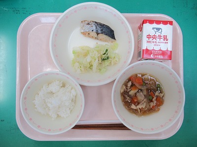 本日の献立:ごはん・牛乳・豚どんぶり・さわらの香味焼き・即席漬け