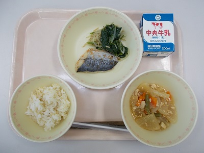 玄米ごはん、鰆のゆず塩こうじ焼、春大根のそぼろ煮、ほうれん草とシラスのなめ茸あえ、牛乳