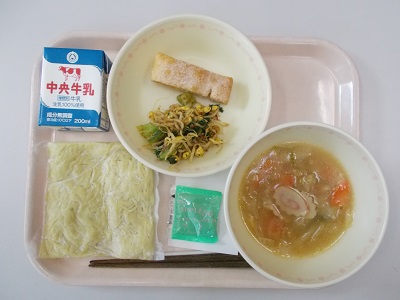 今日の給食は長崎・高知のご当地献立でした。長崎ちゃんぽんは野菜もいっぱい食べることができて栄養満点でした。デザートの手作りアップルパイはカリッカリに焼いてあり、リンゴジャムをつけて、おいしくいただきました。