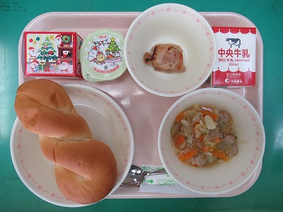 今日は、クリスマス献立です。ポトフは、フランスの家庭料理の一つです。牛肉やソーセージなどと野菜をじっくり煮込んだ料理です。寒い時期の体を温めてくれます。児童たちは朝から今日のセレクトデザートをとても楽しみにしていました。みんなはどちらを食べたのかな?