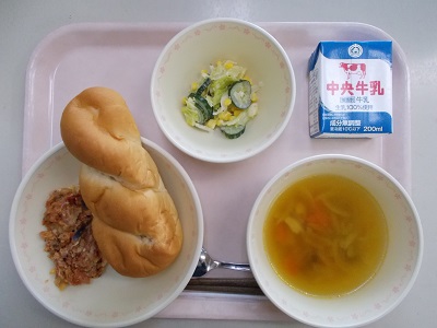 あいちのツイストパン、トマトとサバのうま味たっぷりうまうまチーズ焼き、コーンサラダ、コンソメスープ、牛乳