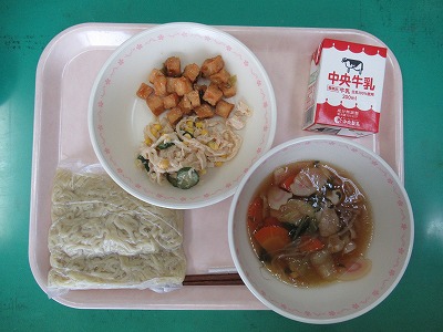 本日の献立:しょうゆラーメン・牛乳・厚揚げのユーリンチー風・切り干しバンバンジー