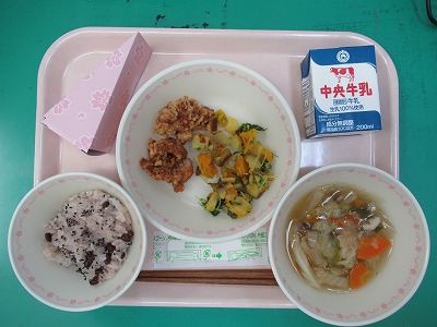 本日の献立:赤飯・牛乳・鶏のから揚げ・春色浸し・春野菜のすまし汁・お祝いデザート