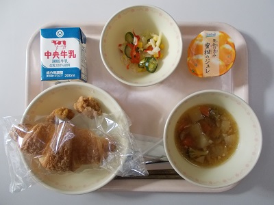 クロワッサン、手作りフライドチキン、カラフルサラダ、冬野菜のスープ、セレクトデザート(ストロベリーケーキ、チョコレートクレープ、みかんジュレ)、牛乳