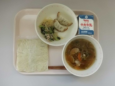 今日の献立に、醤油ラーメンがあります。給食のラーメンは、醤油・味噌・豚骨・塩レモンなど、たくさんの味の種類があります。具には、野菜もたくさん入って栄養も満点です。今日もおいしくいただきました。