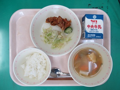 本日の献立:ご飯・牛乳・鶏肉の唐揚げ・キャベツの塩レモン和え・ワンタンスープ