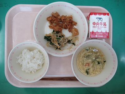 本日の献立:ご飯・牛乳・豚肉とれんこんの甘辛揚げ・ほうれん草のお浸し・愛西みつばのかき玉汁