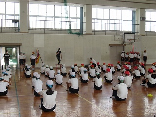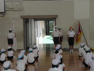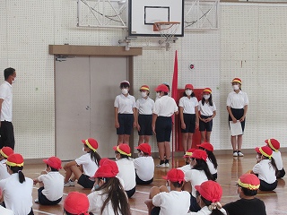 朝方雨が降り、運動場の状態がよくなかったため体育館で運動会の開閉会式の練習をしました。お辞儀の仕方や国旗掲揚の時の体の向きなどを確認しました。皆、とても集中して取り組むことができ、初めての練習とは思えないほどでした。