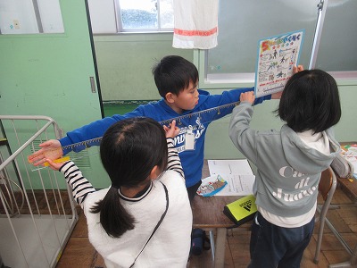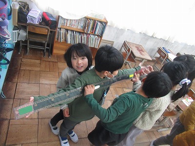 100㎝をこえるものとして身近にあるのは、『身長』ですね。今日は、自分の両手を広げた長さを、100㎝ものさしを使ってはかる活動をしました。