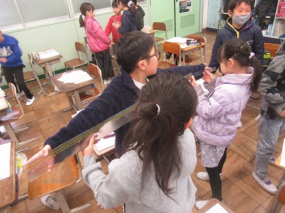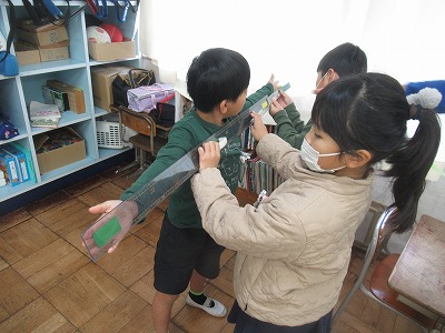 「あれ?100㎝ものさしでは足りないね~…」と、その続きに、自分の定規をつなげて、「100㎝と20㎝だから、120㎝!」「ん?身長とほぼおなじだなぁ~」と気づきがつぶやき声としてあがっていました。みんな自分の両手を広げた長さをはかろうと協力し、実感を伴う学びをすすめていました。