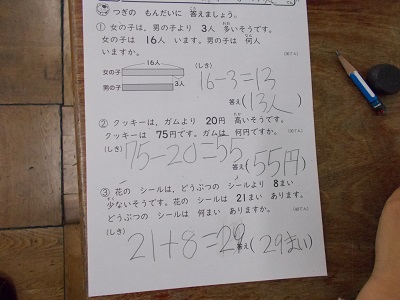 算数の文章題のに取り組み、解き終わった子から本読みをして答え合わせの時間を待つ姿が見られました。