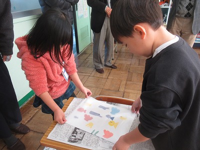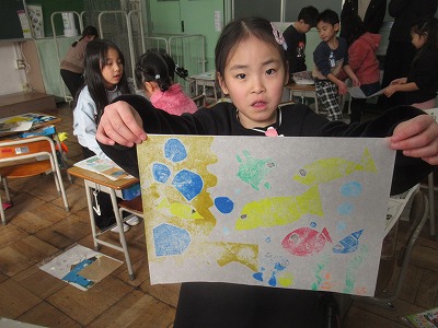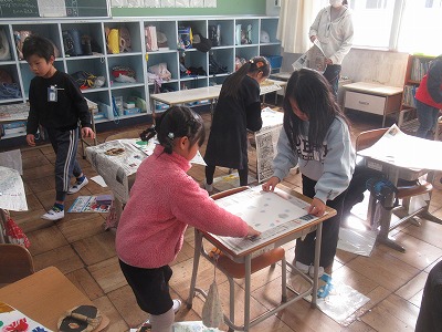 今日は、その版板に、濡らした紙をのせてこすりつけると・・・、シールの色が紙に刷り上がってきます。ずれないように、2人ペアで協力して作業を進めることができました。