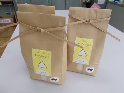 今日は先日稲刈り体験で刈り取った稲穂を戸倉トラクターさんで精米後、1kgずつ袋詰めした「あいちのかおり」を届けていただきました。