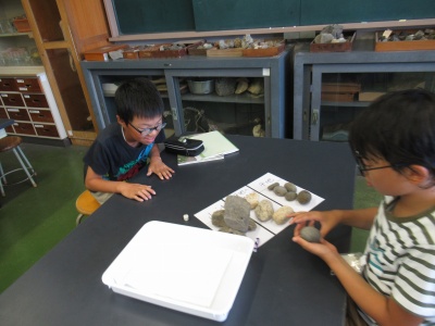 川の山の中(上流)、平地にはいったところ(中流)、平地(下流)で、石の大きさや形はどう違うのか、写真ではなく、実際に拾ってきた石を観察しながら、分けるゲームをしました。「角張っているから・・・」「まるみをおびているから・・・」などと、話し合いながら判別していました。