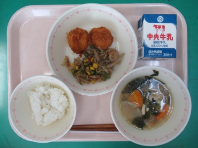 本日の献立:ごはん・牛乳・ほたて貝フライ・五目きんぴら・高野豆腐のうまみ汁
