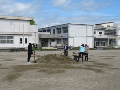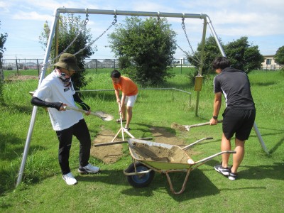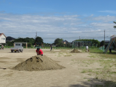 照り付ける強い日差しの下、熱中症に気を付けて作業を行いました。運動場だけでなく、みんながたくさん使用した遊具(ブランコや鉄棒など)の部分にも土を補充しました。9月から、休み時間に運動場で鬼ごっこやサッカー・ドッジボールなど、思いっきり遊んでくださいね。