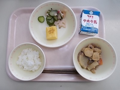 ごはん、かんとう煮、厚焼き玉子、キュウリの梅あえ、牛乳