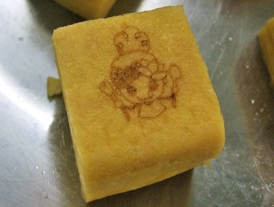 今日の厚焼き玉子には、愛西市学校給食のマスコットキャラクター「モグモグちゃん」が焼き印で絵付けされていました。「モグモグちゃん」は本校の児童がデザインしたイラストです。かわいらしいイラストで食べるのがもったいなかったですが、楽しみながらモグモグとよく噛んでおいしくいただきました。