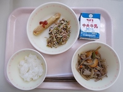ごはん、五目きんぴら、ウインナーの天ぷら、無限ビーマン、牛乳