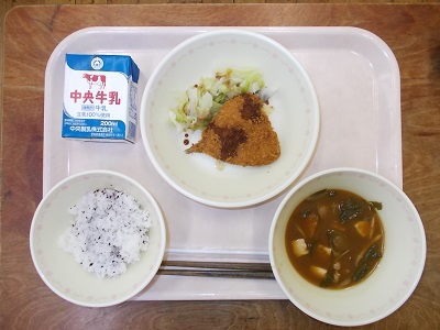 ゆかりごはん、あじフライ、ゆでキャベツ、夏野菜の味噌汁、牛乳