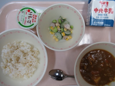 金芽ロウファット玄米ご飯 牛乳 カレーライス 兄弟豆サラダ りんごヨーグルト