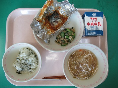 本日の献立:わかめご飯・牛乳・鯖の銀紙焼き・きりざい・おくずかけ