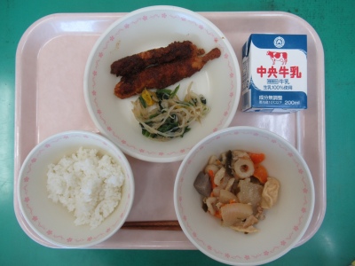 本日の献立 ごはん・牛乳・子持ちししゃもフライ甘みそかけ・関東煮・彩り野菜のお浸し