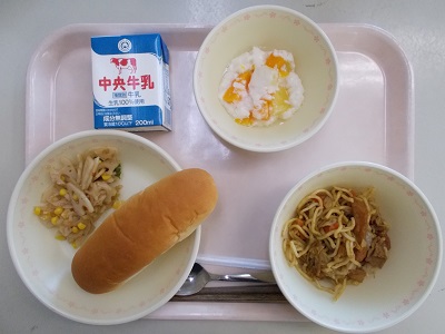 小型ロールパン、焼きそば、レンコンサラダ、フルーツババロア、牛乳