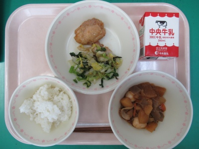 本日の献立:ごはん・牛乳・鶏の和風ステーキ・昆布和え・みそおでん