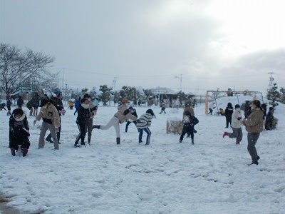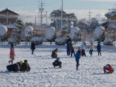 時間・場所・学年を区切って、運動場で雪遊びをしました。子どもたちも先生も大いにはしゃぎ、久しぶりの降雪を楽しみました。